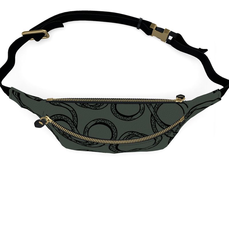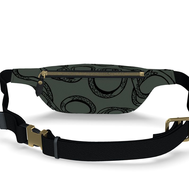 • Load image into Gallery viewer, Gray fanny pack with snake pattern and gold zipper on a white background