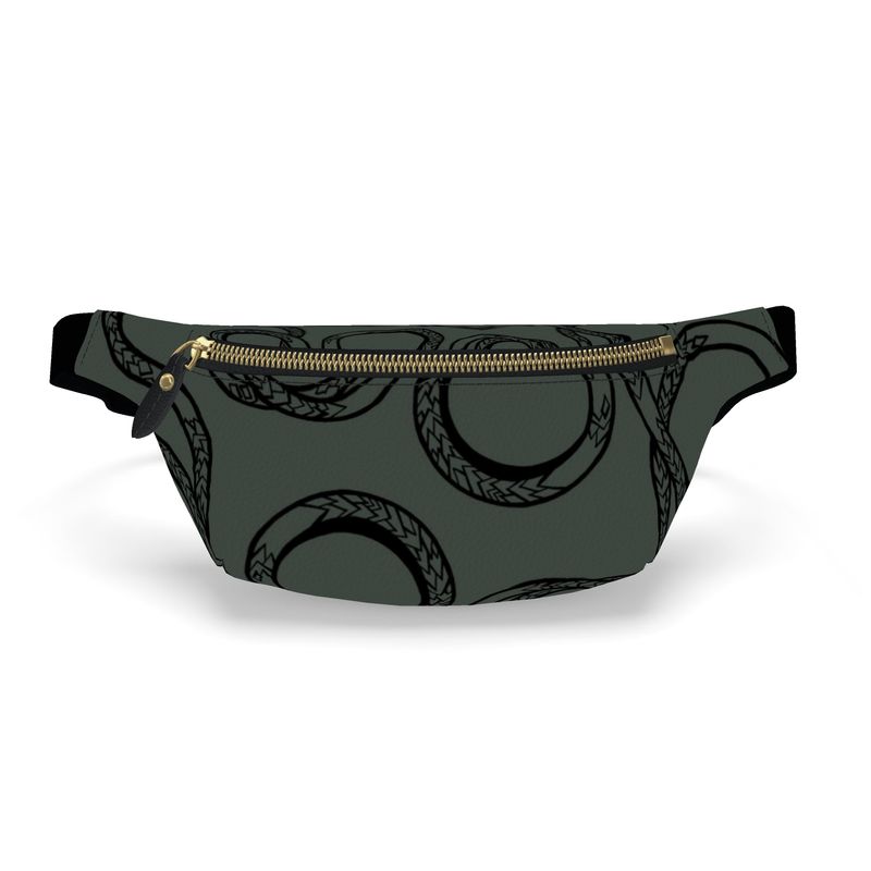 Gray fanny pack with snake pattern and gold zipper on a white background
