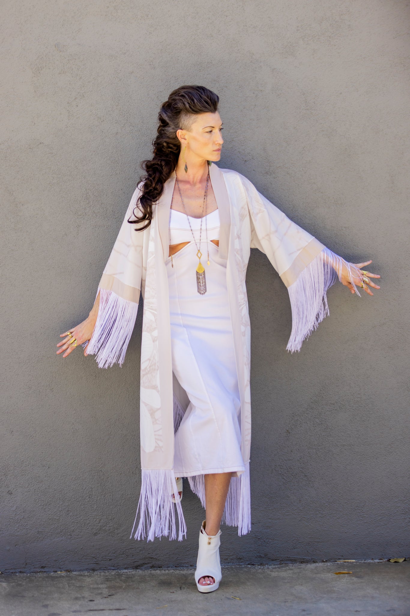 Its defining details set it apart: a deep chevron back adorned with fringe, sleeves edged with cascading fringe for dynamic movement, and a textile that is both custom-designed and non-wrinkling. Together, these elements create a kimono that is bold yet timeless, a piece that honors craftsmanship while offering freedom, sensuality, and an undeniable statement presence.