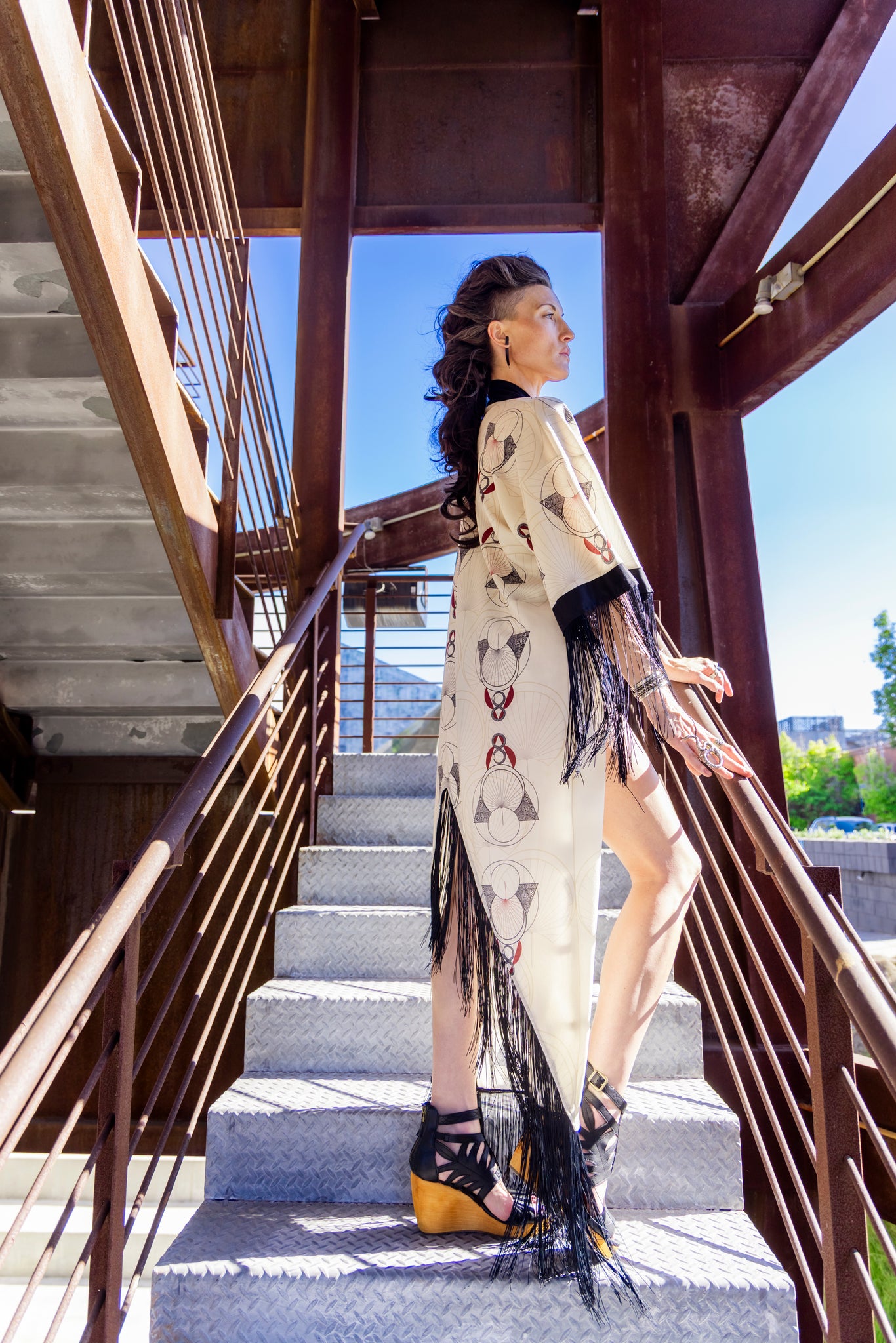 Its defining details set it apart: a deep chevron back adorned with fringe, sleeves edged with cascading fringe for dynamic movement, and a textile that is both custom-designed and non-wrinkling. Together, these elements create a kimono that is bold yet timeless, a piece that honors craftsmanship while offering freedom, sensuality, and an undeniable statement presence.